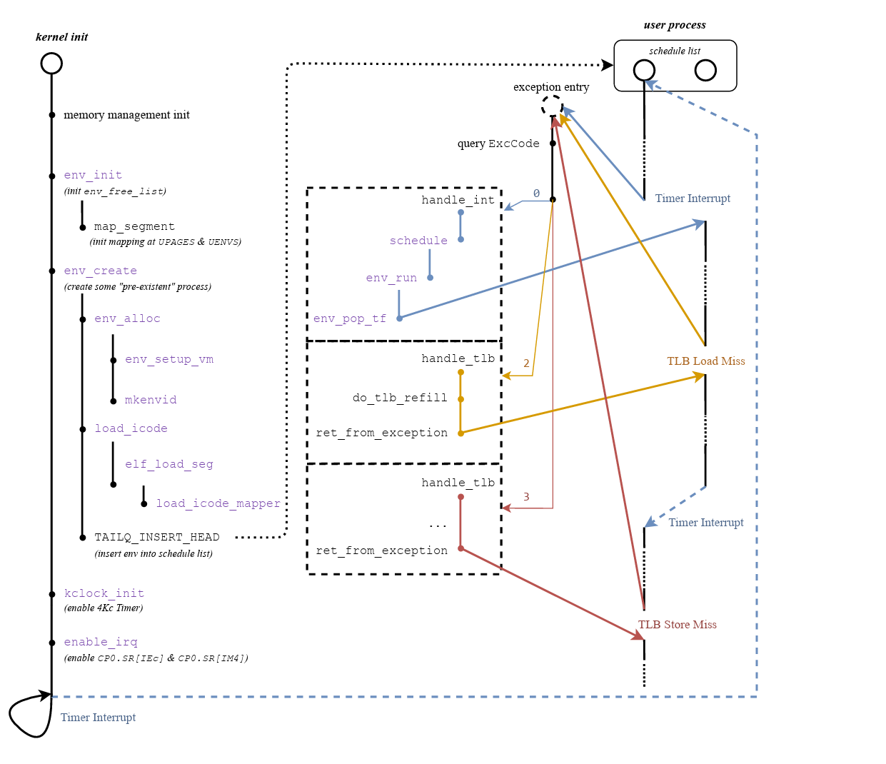 调度函数 schedule 以及其中逐级调用的 env_run、env_pop_tf 和 ret_from_exception 函数都是不返回(no return)的函数,被调用后会从内核跳转到被调度进程的用户程序中执行。在 MIPS 中通常使用 j 指令而非 jal 调用不返回的函数,因为它们不会再返回到其调用者。
