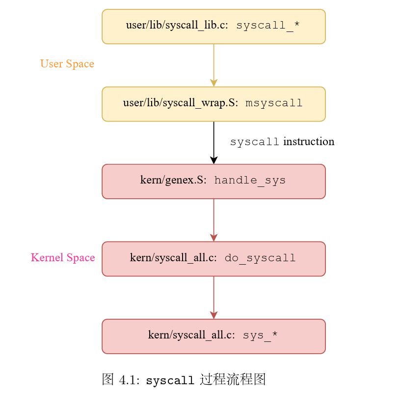 我们通过Trapframe结构体保存了用户现场的上下文,以此在内核态进行传参,同时再通过系统调用处理函数表跳转到具体的调用函数,同时又在tf->regs[2]中,即v0寄存器中保存系统调用的返回值。