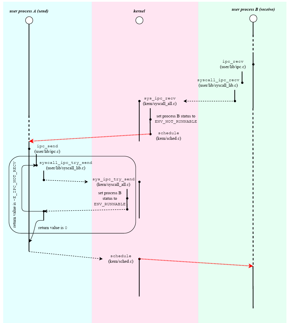 按照上述的图示去理解ipc的通信过程,即一个进程先发出ipc_recv的信号之后,再调用schedule(1)切换到另一个进程进行ipc_send,从而实现两个进程间的通信。