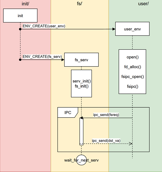 ENV_CREATE(user_env)和ENV_CREATE(fs_serv)由初始化进程init()执行以创建用户和文件系统服务环境。init()启动时创建这些环境,其中fs和user环境执行它们的初始化工作。fs环境初始化后,serv_init()和fs_init()函数运行,进入serv()循环,监听ipc_receive()的请求并将环境标记为ENV_NOT_RUNNABLE,直到接收到user环境的ipc_send(fsreq)请求再变为可运行。user环境向fs环境发送ipc_send(fsreq)请求来请求文件访问服务,请求后自身进入ENV_NOT_RUNNABLE状态等待响应。响应文件访问请求后,ipc_send(dst_va)将请求结果发送回user环境,此时fs环境再次进入ENV_NOT_RUNNABLE状态等待下次请求处理。